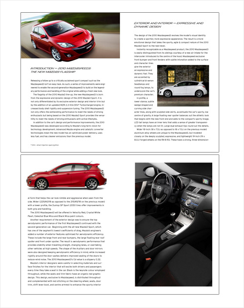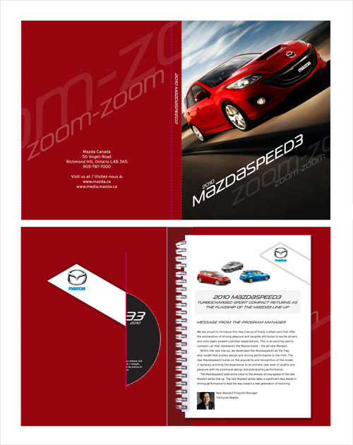 The 2010 Mazdaspeed3 Press Kit is distributed to the Automotive press across Canada.